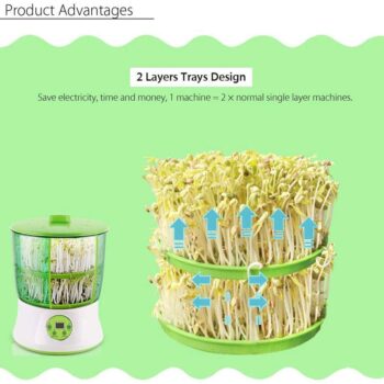 Function – The machine can sprout multiple types of seeds,such as soya beans,peas,mung beans,black beans,radish seeds,string beans,wheat,red beans. No soil required, 3 temperature modes, 360° rotary spray, automatic water circulation system to provide sufficient water to grow the sprouts.